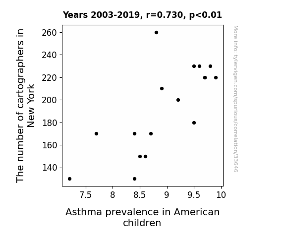 This means 53.4% of the change in the one variable (i.e., Asthma prevalence in American children) is predictable based on the change in the other (i.e., The number of cartographers in New York) over the 17 years from 2003 through 2019.