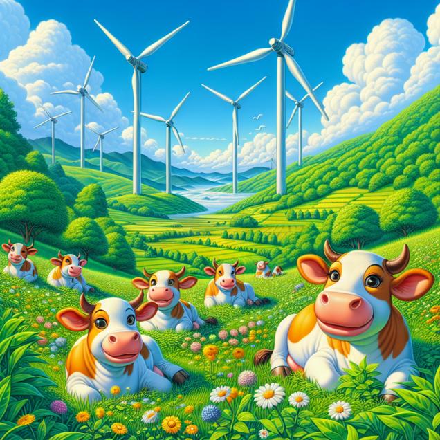 ChatGPT: Generate an idyllic scene of a bright, pastel-colored, cartoon-style depiction of a lush green pasture in China. Within it, include adorable cows grazing contently on rich, green grass, with smiley faces and gentle expressions as they enjoy their meal. Above them, fluffy, cute white clouds float in a bright blue sky, adding to the cheerful atmosphere. In the distance, integrate sleek, modern wind turbines spinning gracefully in the breeze, capturing the positive, eco-friendly depiction of energy production.