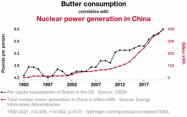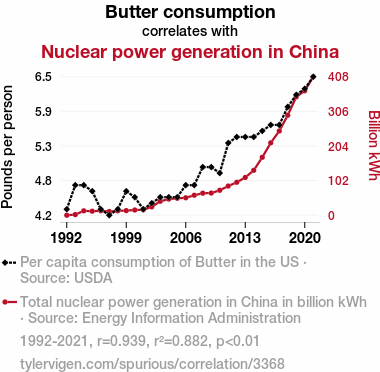 - The spurious research paper: Spreading the Connection: A Margarinal Analysis of Butter Consumption and Nuclear Power Generation in China