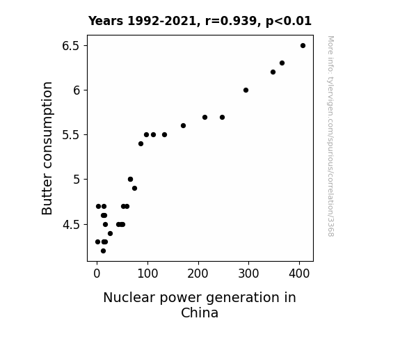 butter consumption, nuclear power generation, China, correlation, USDA data, Energy Information Administration, 1992-2021, correlation coefficient, statistical analysis, dietary habits, energy production