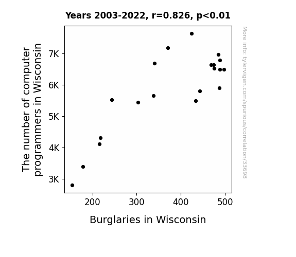 This means 68.2% of the change in the one variable (i.e., Burglaries in Wisconsin) is predictable based on the change in the other (i.e., The number of computer programmers in Wisconsin) over the 20 years from 2003 through 2022.