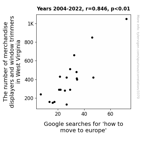 merchandise displayers, window trimmers, West Virginia, Google searches, move to Europe, correlation, Bureau of Labor Statistics, Google Trends, migration desires, retail aesthetics, statistical significance, European relocation, academic inquiry