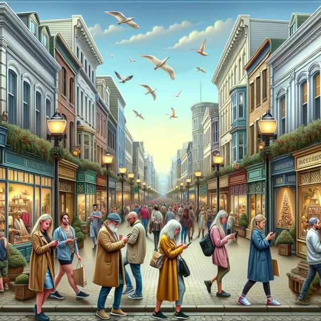 Prompt: Prompt: Generate an image representing the vibrant storefronts of downtown West Virginia, showcasing the exquisite displays and seasonal decor that captivate passersby. The scene should convey the allure of European-inspired elegance and organization, with people nearby looking captivated as they type into their phones about moving to Europe. The depiction should include only scenes, people, and objects, it should not include text or speech bubbles.