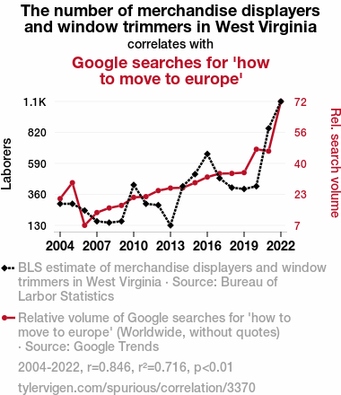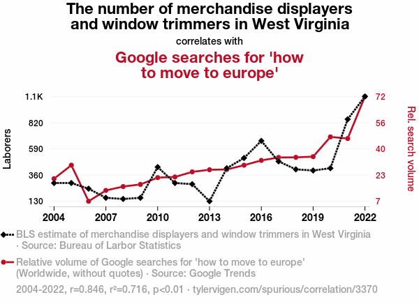 merchandise displayers, window trimmers, West Virginia, Google searches, move to Europe, correlation, Bureau of Labor Statistics, Google Trends, migration desires, retail aesthetics, statistical significance, European relocation, academic inquiry
