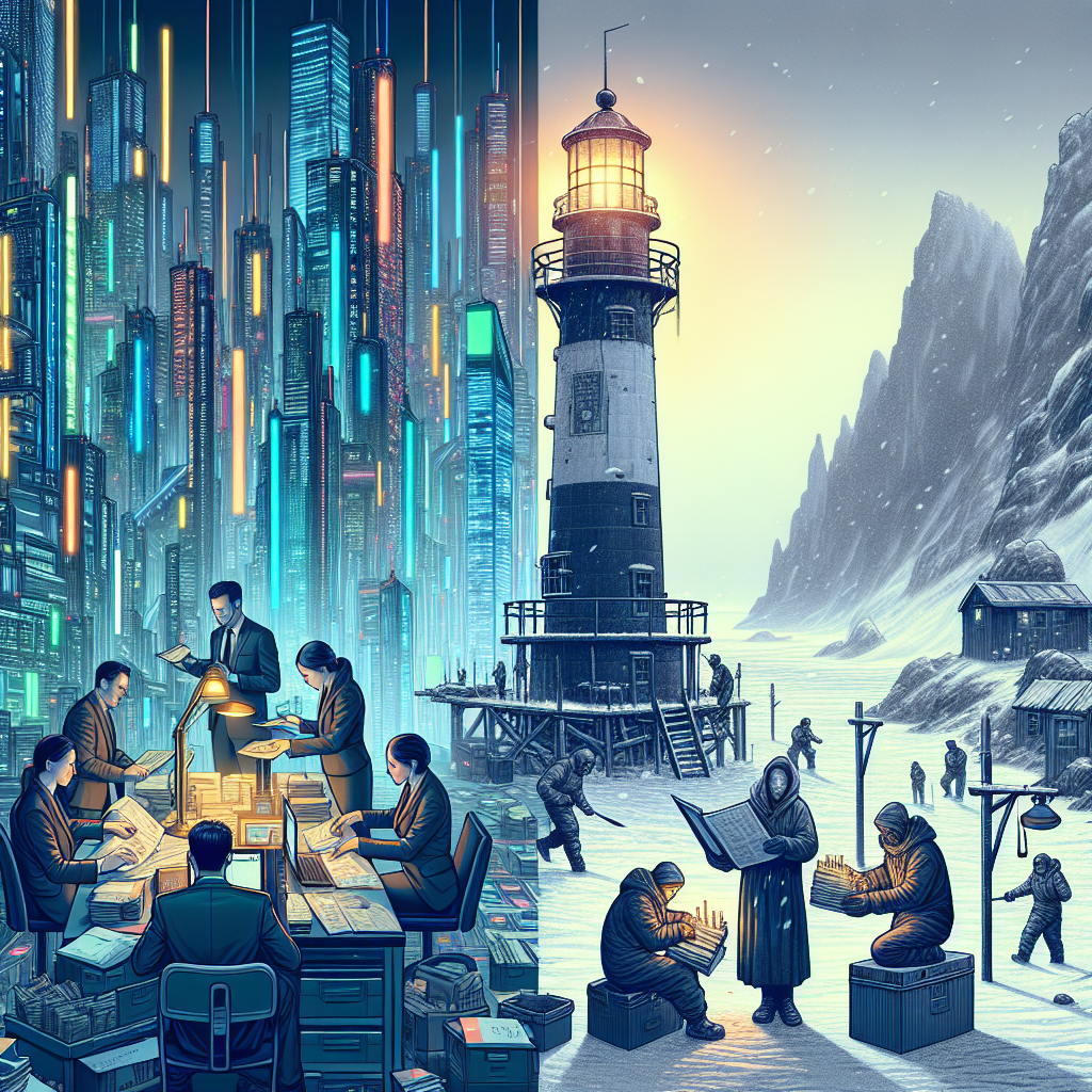Prompt: Generate an image that showcases the bustling, cyberpunk streets of Washington, D.C. contrasted with the remote and rugged landscape of the Falkland Islands. The scene should feature futuristic skyscrapers and neon lights in the background, while in the foreground, archivists can be seen moving quickly amidst the hustle and bustle, carrying neatly organized files and papers. Meanwhile, on the Falkland Islands, a solitary lighthouse stands tall against the rocky terrain, with the lighthouse keeper diligently refilling kerosene lamps. The juxtaposition of the two settings should convey the sharp contrast between high-tech city life and the isolated, rugged nature of the remote islands, hinting at the interconnectedness of these seemingly distant places. The depiction should include only scenes, people, and objects, it should not include text or speech bubbles.