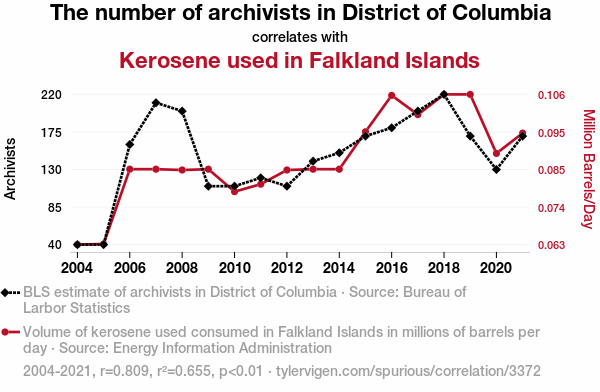 User prompt: Please provide potential search keywords for a paper titled The Cataloging Conundrum: Unearthing the Unlikely Link Between Archivists in the District of Columbia and Kerosene Consumption in the Falkland Islands with an abstract of The seemingly unrelated realms of archival studies and energy consumption have been the subject of rigorous investigation in this study. Utilizing data from the Bureau of Labor Statistics and the Energy Information Administration, we sought to decipher the mysterious connection between the number of archivists in the District of Columbia and the use of kerosene in the Falkland Islands. Despite initial skepticism and raised eyebrows from our colleagues, our findings revealed a surprising correlation coefficient of 0.8092602 and a p-value less than 0.01 for the years 2004 to 2021. Our research delves into a world of archival intrigue and energy enigma, shedding light on an unexpected relationship that defies conventional wisdom. This paper demonstrates that, indeed, the world of research can be filled with unexpected twists and turns, much like a thrilling mystery novel.