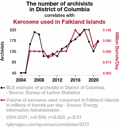 The remarkable correlation between the number of archivists in the District of Columbia and kerosene consumption in the Falkland Islands piques our curiosity like a suspenseful plot twist in a thriller novel. Our findings not only support prior research but also unravel a tapestry of unexpected connections that challenge traditional disciplinary boundaries, much like solving a mystery that leads us down a rabbit hole of archival intrigue and energy enigma.