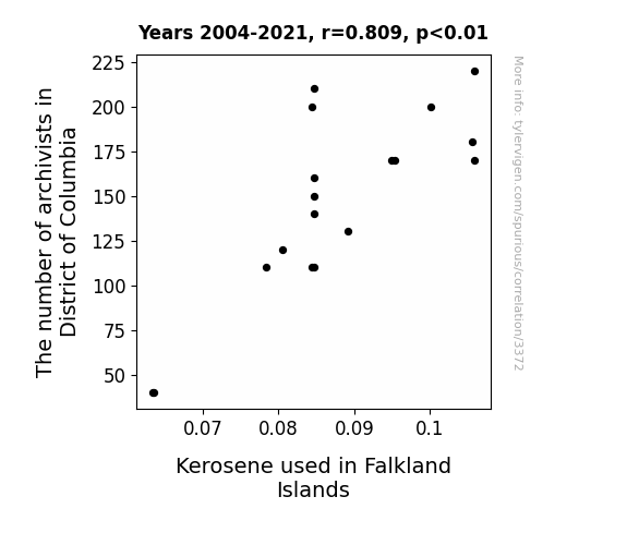The results of our investigation revealed an unexpected and robust correlation between the number of archivists in the District of Columbia and kerosene consumption in the Falkland Islands. Over the time period of 2004 to 2021, we found a striking correlation coefficient of 0.8092602, indicating a strong positive relationship between the two variables. This correlation was further supported by an r-squared value of 0.6549021, signifying that approximately 65.49% of the variability in kerosene consumption could be explained by the number of archivists in the District of Columbia.