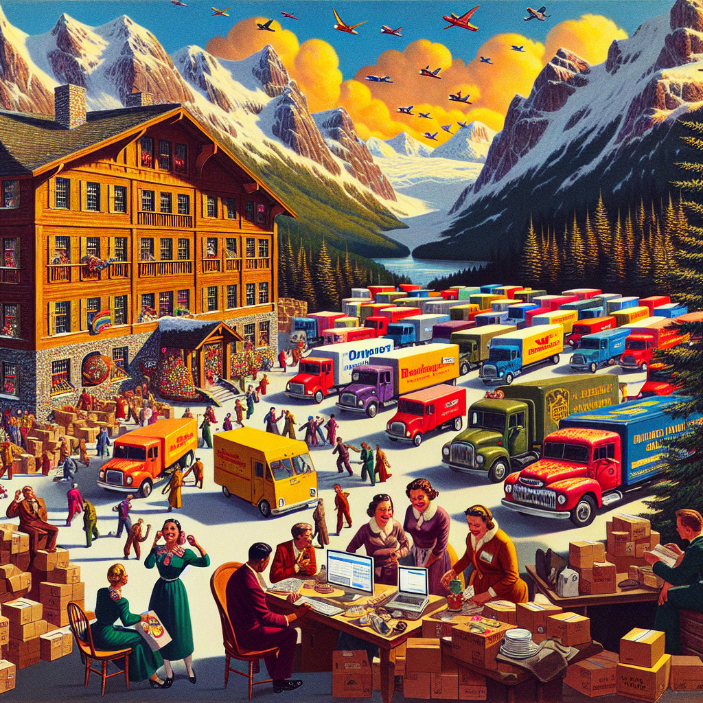 ChatGPT: In a quaint Vermont hotel, a group of hotel managers eagerly huddles around a computer, each enthusiastically adding peculiar items to their Amazon carts. Meanwhile, a mountain of Amazon boxes is being delivered to the hotel entrance, showcasing the increase in Amazon's shipping revenue.