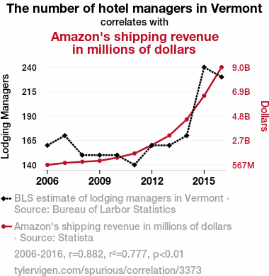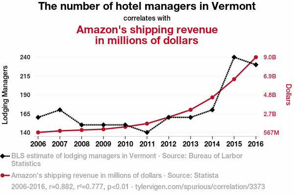 - The spurious research paper: Checking in at the Inn: The Relationship Between the Count of Hotel Managers in Vermont and Amazon's Shipping Gains