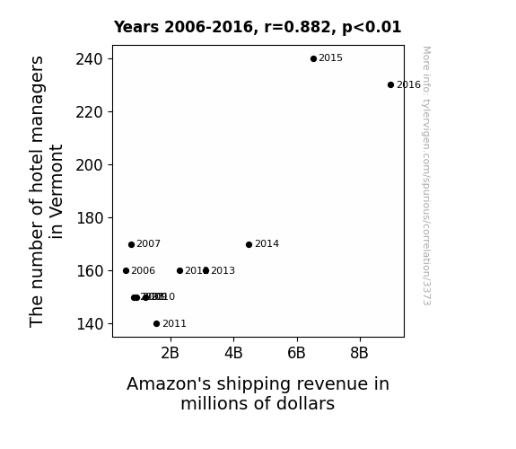 Upon donning our metaphorical Sherlock Holmes hats and delving into the depths of our data, we uncovered a correlation coefficient of 0.8815298 between the number of hotel managers in Vermont and Amazon's shipping revenue in millions of dollars. As any seasoned researcher can attest, this correlation is about as substantial as a towering stack of Amazon delivery boxes at your front door.