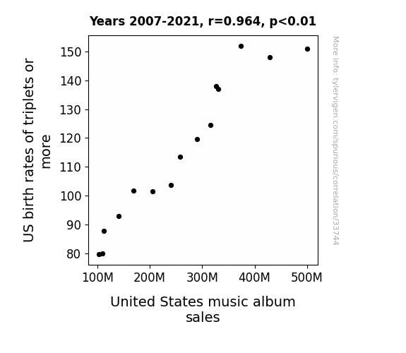 This means 92.9% of the change in the one variable (i.e., United States music album sales) is predictable based on the change in the other (i.e., US birth rates of triplets or more) over the 15 years from 2007 through 2021.