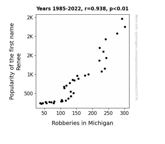 This means 87.9% of the change in the one variable (i.e., Robberies in Michigan) is predictable based on the change in the other (i.e., Popularity of the first name Renee) over the 38 years from 1985 through 2022.