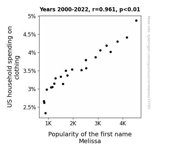 This means 92.4% of the change in the one variable (i.e., Popularity of the first name Melissa) is predictable based on the change in the other (i.e., US household spending on clothing) over the 23 years from 2000 through 2022.
