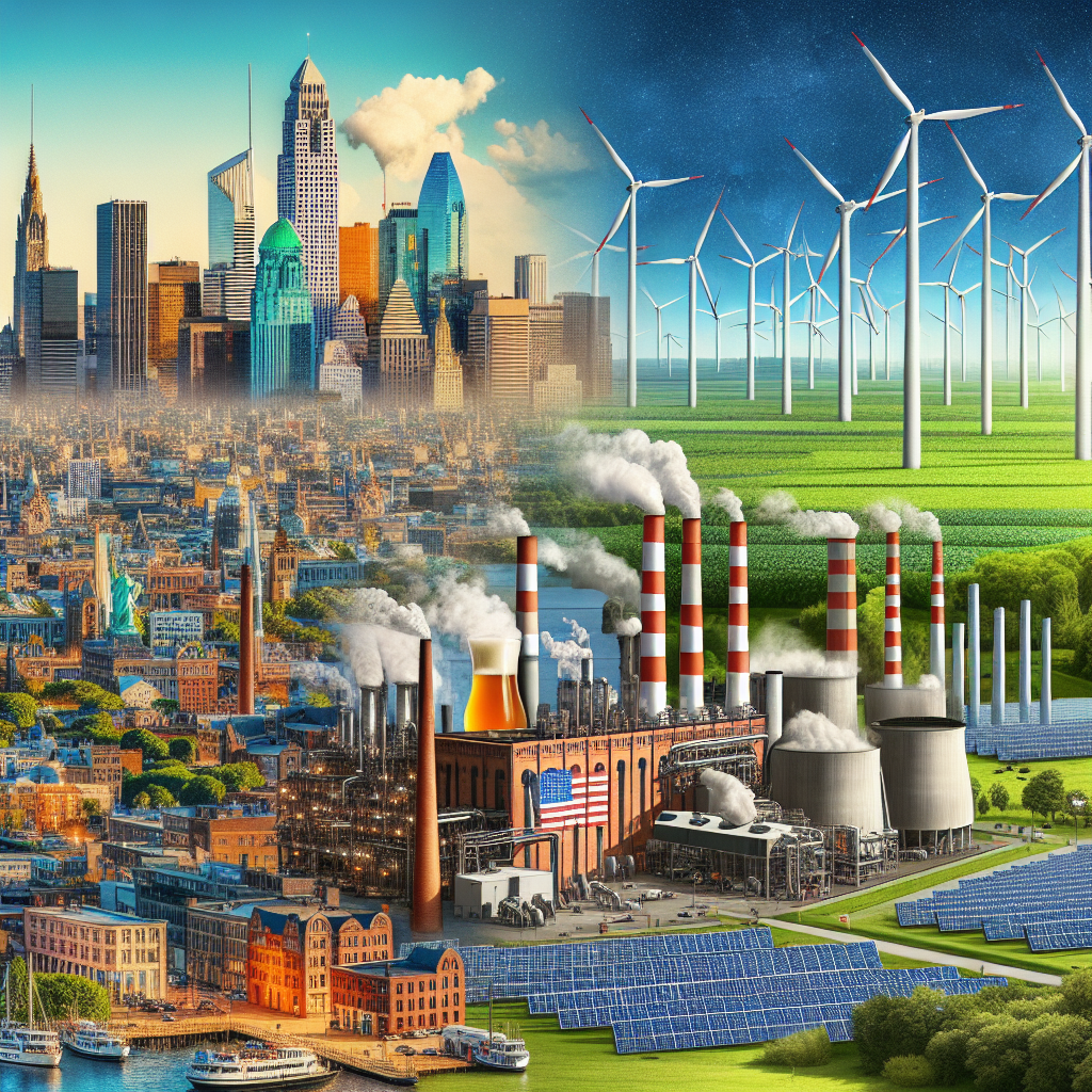 ChatGPT: Generate an image capturing the juxtaposition between a bustling American city and a serene Uruguayan countryside united by sustainable energy. In the foreground, depict a row of vibrant breweries with tall smokestacks emitting steam against the backdrop of the cityscape. Next to them, show a lush Uruguayan countryside with towering wind turbines and rows of solar panels. A biomass power plant, fueled by leftover grains from the American breweries, stands prominently. The scene should seamlessly blend the two environments, showcasing the harmonious coexistence of urban life and natural landscapes powered by sustainable energy sources.