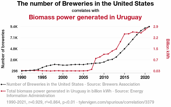 (Fig. 1, which is not included here, illustrates the strong positive correlation between the number of breweries in the United States and biomass power generated in Uruguay.)
