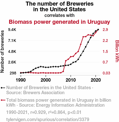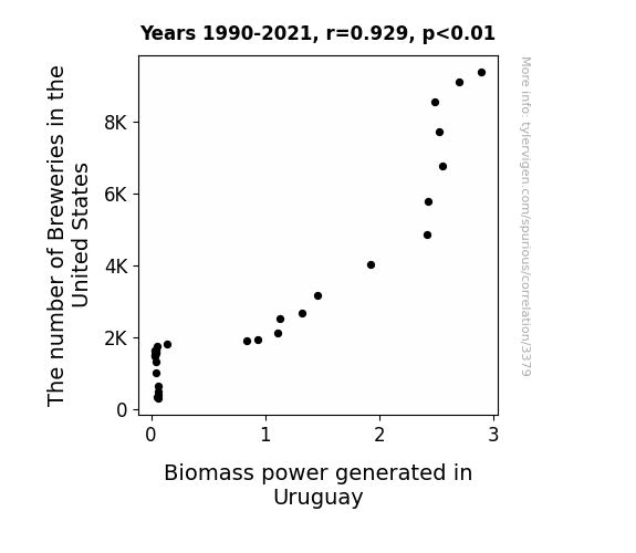 User prompt: Please provide potential search keywords for a paper titled Brewing Up Biomass: A Sudsy Connection Between Breweries in the United States and Biomass Power Generation in Uruguay with an abstract of The relationship between the number of breweries in the United States and biomass power generated in Uruguay has long been overlooked in the academic literature. In this study, we delved into this marvellous and quirky area of investigation to unravel the potential interplay between these seemingly unrelated factors. Using data from the Brewers Association and Energy Information Administration, we performed a comprehensive analysis covering the period from 1990 to 2021. Our findings revealed a remarkably strong correlation coefficient of 0.9292523 and a statistically significant p-value of less than 0.01, indicating a robust relationship between the two variables.