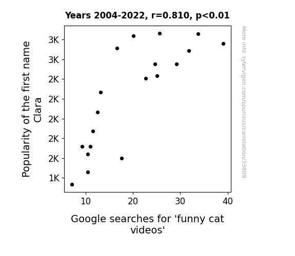 This means 65.6% of the change in the one variable (i.e., Google searches for 'funny cat videos') is predictable based on the change in the other (i.e., Popularity of the first name Clara) over the 19 years from 2004 through 2022.