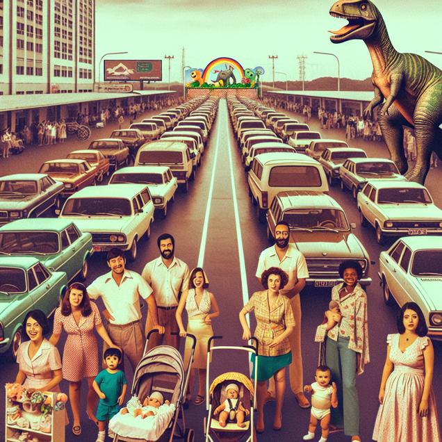 ChatGPT: Generate an image in the style of a vintage Polaroid photo showing a bustling baby shower scene in Brazil. The focus is on parents arriving in their cars, contributing to a rise in fossil fuel use due to the popularity of the name "Jayce." The background features a trail of cars leading to the "Jayce and the Fossil-fuel Factory" themed party, with dinosaur-themed nursery decor prominently displayed. The overall tone should capture the excitement and trendiness of the event, while subtly highlighting the unintended environmental impact.