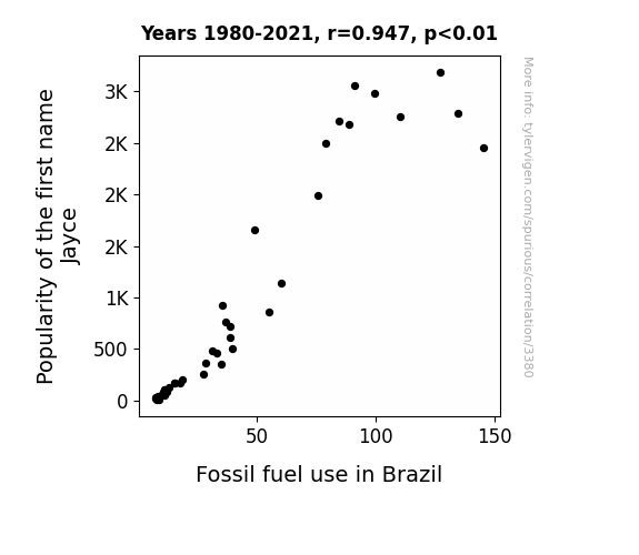 This means 89.7% of the change in the one variable (i.e., Fossil fuel use in Brazil) is predictable based on the change in the other (i.e., Popularity of the first name Jayce) over the 42 years from 1980 through 2021.