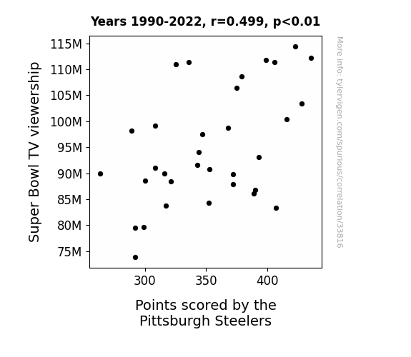 This means 24.9% of the change in the one variable (i.e., Points scored by the Pittsburgh Steelers) is predictable based on the change in the other (i.e., Super Bowl TV viewership) over the 33 years from 1990 through 2022.