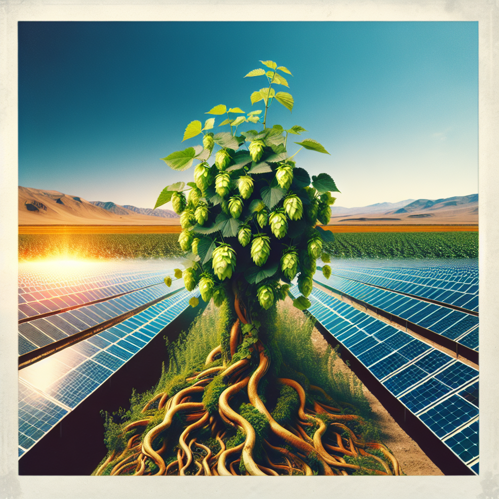 ChatGPT: Generate an image of a surreal landscape that blends the United States and Peru scenes in a Polaroid photo style. Create a vibrant, lush field of hops plants in the foreground, emitting a sweet, aromatic scent. The plants are thriving and cascading across the horizon, amplifying the sense of growth and prosperity. Integrate the image with a sun-drenched field of solar panels in the background, absorbing the intense rays of sunlight. The juxtaposition of the two scenes should convey a sense of harmony and interconnectedness, capturing the essence of sustainability and innovation.