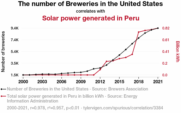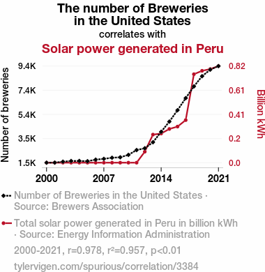 - The spurious research paper: Brewing Up a Solar Storm: The Surprising Relationship Between U.S. Breweries and Solar Power Generation in Peru