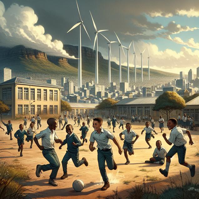 ChatGPT: Create an image of a South African cityscape with a bustling schoolyard in the foreground. The schoolyard is filled with children playing and laughing, their vibrant energy filling the scene. Focus on a group of boys joyfully chasing each other, their laughter captured in the air. Theodore stands tall and confident, surrounded by his friends. Meanwhile, in the distance, a large wind farm proudly stands, its towering turbines spinning gracefully in the breeze. The clean, renewable energy generated by the wind farm powers the city, symbolizing the cultural shift towards sustainability inspired by Theodore's namesake, Teddy Roosevelt's conservation efforts. The image should capture the exuberant atmosphere of the schoolyard against the backdrop of the city and the majestic wind farm.
