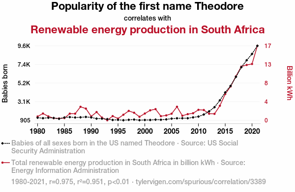 This means 95.1% of the change in the one variable (i.e., Renewable energy production in South Africa) is predictable based on the change in the other (i.e., Popularity of the first name Theodore) over the 42 years from 1980 through 2021.