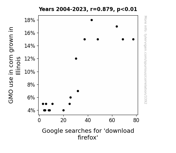 This means 77.3% of the change in the one variable (i.e., Google searches for 'download firefox') is predictable based on the change in the other (i.e., GMO use in corn grown in Illinois) over the 20 years from 2004 through 2023.