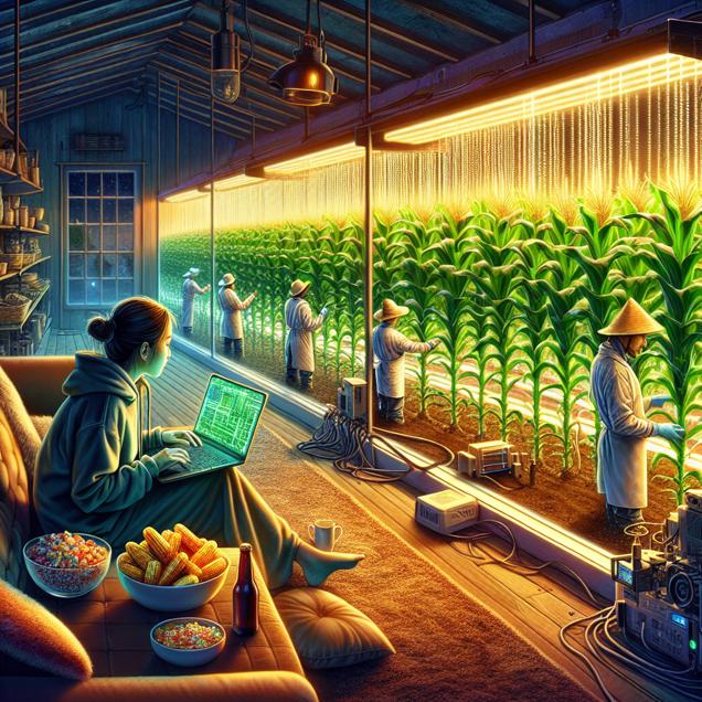 Prompt: [ Concept art ] Depict a bustling, high-tech kitchen in the heart of rural Illinois, where farmers are diligently tending to rows of vibrant, genetically modified corn plants. The kitchen is filled with the warm glow of artificial grow lights and the hum of advanced agricultural machinery. Meanwhile, in a cozy living room nearby, a person is seated on a plush couch, surrounded by an assortment of sugary snacks. They are engrossed in using a modern computer to conduct a late-night web search for "download firefox", their screen casting a soft, ambient glow in the dimly lit room. The depiction should include only scenes, people, and objects, it should not include text or speech bubbles.