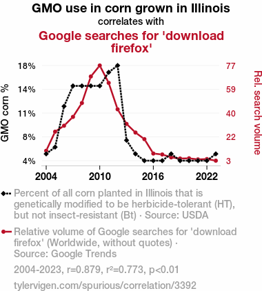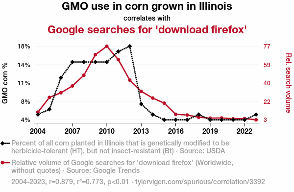 This means 77.3% of the change in the one variable (i.e., Google searches for 'download firefox') is predictable based on the change in the other (i.e., GMO use in corn grown in Illinois) over the 20 years from 2004 through 2023.