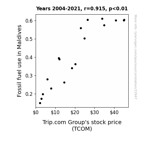 This means 83.7% of the change in the one variable (i.e., Trip.com Group's stock price (TCOM)) is predictable based on the change in the other (i.e., Fossil fuel use in Maldives) over the 18 years from 2004 through 2021.