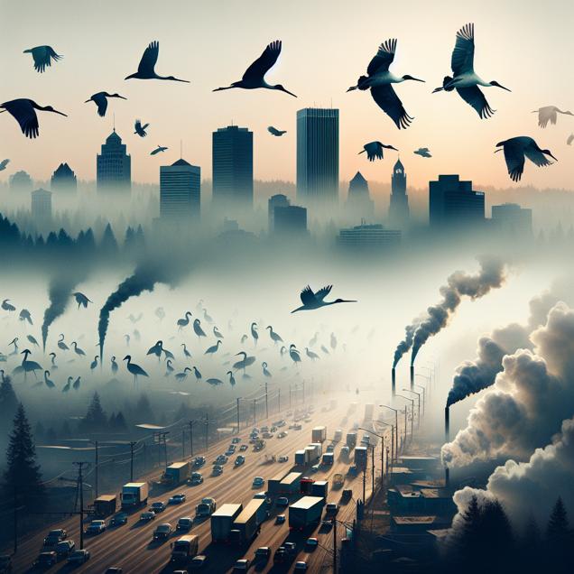ChatGPT: [Concept art] Generate an image of the hazy skyline of Grants Pass, Oregon, with the distinct silhouette of migratory burundi birds attempting to navigate through the thick smog. In the foreground, depict the bustling streets of Burundi, showing cars and trucks emitting smoke from their fossil fuel engines, contributing to the already polluted air. Let the contrast between the natural struggle of the birds and the human-induced pollution be vividly depicted.