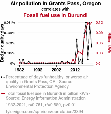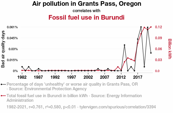 This means 58% of the change in the one variable (i.e., Fossil fuel use in Burundi) is predictable based on the change in the other (i.e., Air pollution in Grants Pass, Oregon) over the 40 years from 1982 through 2021.