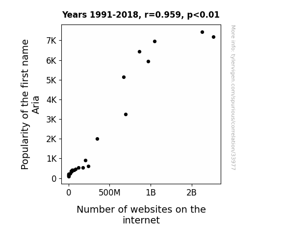 This means 91.9% of the change in the one variable (i.e., Number of websites on the internet) is predictable based on the change in the other (i.e., Popularity of the first name Aria) over the 28 years from 1991 through 2018.
