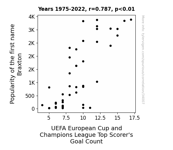 This means 61.9% of the change in the one variable (i.e., UEFA European Cup and Champions League Top Scorer's Goal Count) is predictable based on the change in the other (i.e., Popularity of the first name Braxton) over the 48 years from 1975 through 2022.