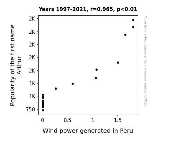 This means 93.1% of the change in the one variable (i.e., Wind power generated in Peru) is predictable based on the change in the other (i.e., Popularity of the first name Arthur) over the 25 years from 1997 through 2021.