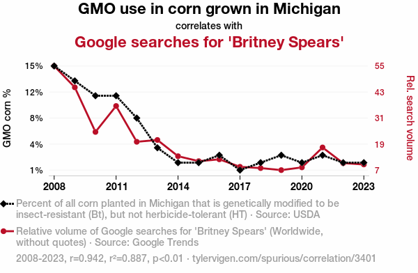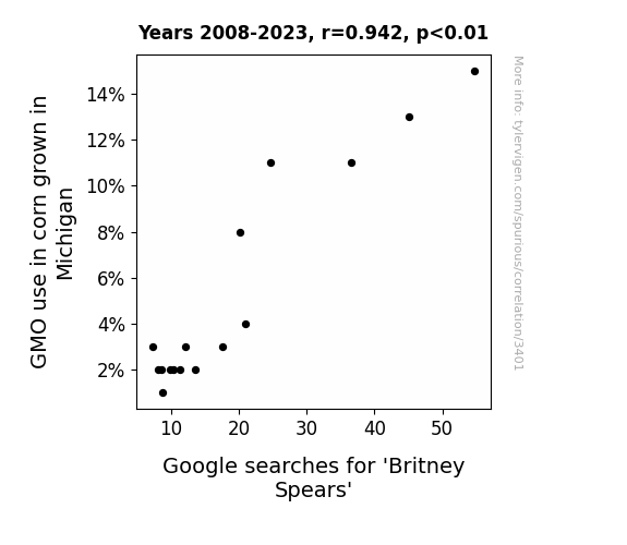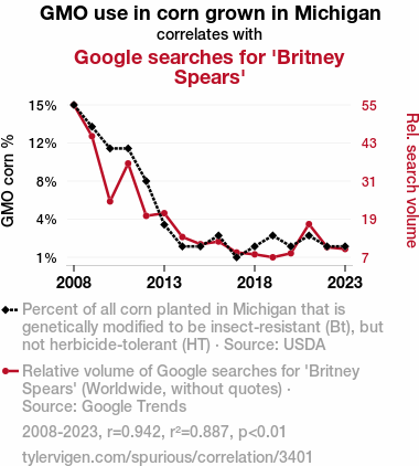 - The spurious research paper: Kernel of Truth: Unearthing the Corny Connection Between GMO Adoption in Michigan and Britney Spears Searches