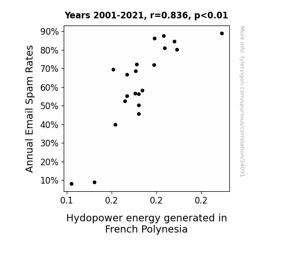 This means 69.8% of the change in the one variable (i.e., Hydopower energy generated in French Polynesia) is predictable based on the change in the other (i.e., Annual Email Spam Rates) over the 21 years from 2001 through 2021.