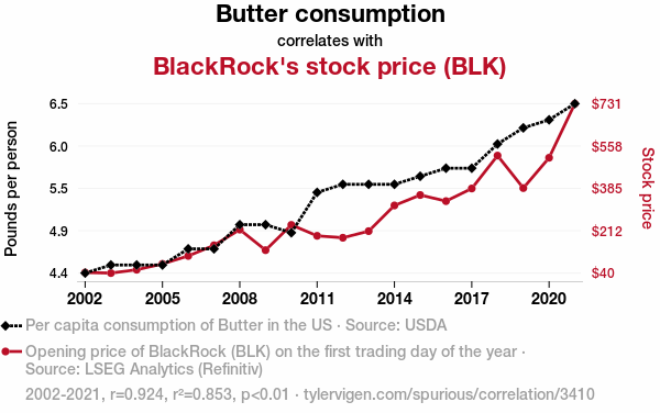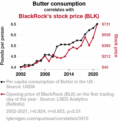 butter consumption, BlackRock stock price, asset management firm, USDA data, LSEG Analytics, Refinitiv, correlation coefficient, statistical significance, financial influences, butterfly effect, market dynamics