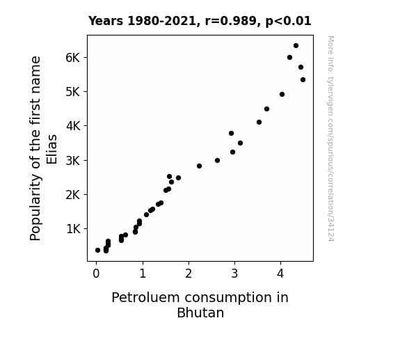 This means 97.7% of the change in the one variable (i.e., Petroluem consumption in Bhutan) is predictable based on the change in the other (i.e., Popularity of the first name Elias) over the 42 years from 1980 through 2021.