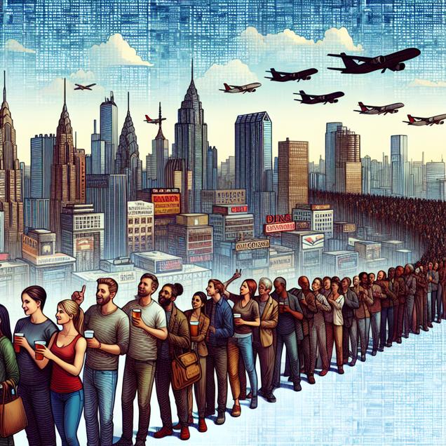 User prompt: Please respond with an image generation prompt that would be likely to create an interesting visual using DALLE-3, using the following style: [ A Discovery magazine cover image ] and depicting this scene: In a bustling city, numerous breweries dot the landscape, each one with a line of people waiting to savor their latest craft creations. Meanwhile, at the airport, TransDigm Group's stock price steadily rises on the ticker tape, reflecting the surge in demand for aircraft components as airlines hurriedly stock up on pretzels to cater to the growing number of beer-loving passengers. Keep the visual depiction simple. Do not include any words or speech bubbles.
