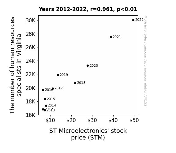 This means 92.3% of the change in the one variable (i.e., ST Microelectronics' stock price (STM)) is predictable based on the change in the other (i.e., The number of human resources specialists in Virginia) over the 11 years from 2012 through 2022.