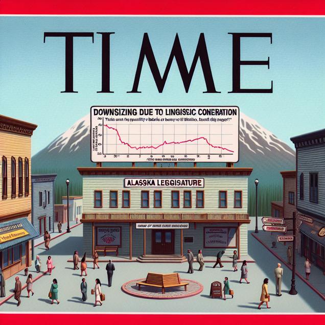 ChatGPT: Generate an image showing a TIME magazine cover featuring the Alaskan town square. The scene depicts a small square with a noticeable decline in the name "Katlynn" on a baby name popularity sign. Connected to this, fewer legislators are seen entering the "Alaska Legislature" building, which features a "Downsizing due to linguistic conservation" sign. The image should convey the interconnectedness of dwindling Katlynn names and legislators in a simple and visually striking manner.