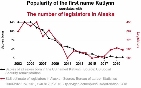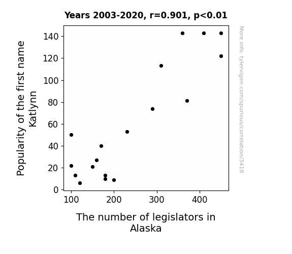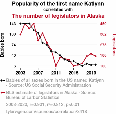 - The spurious research paper: The Katlynn Conundrum: Exploring the Correlation between Popularity of the Name Katlynn and the Number of Legislators in Alaska