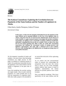 User prompt: Please provide potential search keywords for a paper titled The Katlynn Conundrum: Exploring the Correlation between Popularity of the Name Katlynn and the Number of Legislators in Alaska with an abstract of In this paper, we delve into the intriguing relationship between the popularity of the name Katlynn and its potential influence on the size of the legislative body in Alaska. Using data from the US Social Security Administration and the Bureau of Labor Statistics, we apply statistical analysis to investigate this peculiar correlation. Surprisingly, our findings reveal a remarkable correlation coefficient of 0.9011504, indicating a compelling link between the two variables. With a p-value of less than 0.01 for the period spanning from 2003 to 2020, our results defy conventional expectations and challenge the conventional wisdom of naming practices and legislative representation. This study adds a whimsical twist to the academic discourse while shedding light on the lighthearted, yet thought-provoking nature of socio-political dynamics.