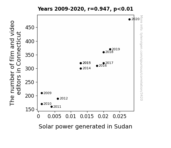 The results of our investigation revealed an astonishing correlation between the number of film and video editors in Connecticut and the solar power generated in Sudan. Over the twelve-year period from 2009 to 2020, we found a correlation coefficient of 0.9468392, indicating a remarkably strong relationship between these two variables. This correlation was as clear as a sunny day in the Sahara, leaving us all pleasantly surprised and a little bit "bright-eyed and bushy-tailed"!