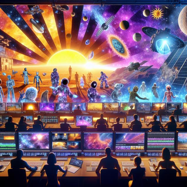 Prompt: [An image that looks like it is a scene from 'Star Wars'] Prompt: In a bustling film studio on an intergalactic planet, a group of alien film and video editors gather around their holographic workstations, busily editing scenes filled with vibrant sunshine and radiant landscapes from various planets. Their editing screens glow with the warmth of golden sunsets, clear blue skies, and otherworldly sunrises. As they meticulously perfect each frame, the positive energy emanating from the sunny scenes seems to surge into the cosmos. Meanwhile, across the galaxy on a distant planet, the solar power stations and energy harvesting arrays begin to hum with newfound energy. The solar power generated increases visibly, brighter and more abundant than before, as the filmmakers' sunny disposition seems to have transcended planetary boundaries, infusing the entire galaxy with the positive energy and clean power that their edited scenes depict. The depiction should include only scenes, people, and objects, it should not include text or speech bubbles.