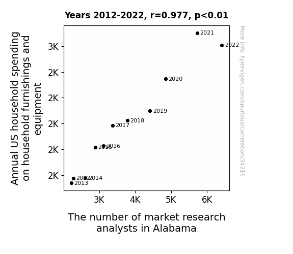 This means 95.4% of the change in the one variable (i.e., The number of market research analysts in Alabama) is predictable based on the change in the other (i.e., Annual US household spending on household furnishings and equipment) over the 11 years from 2012 through 2022.